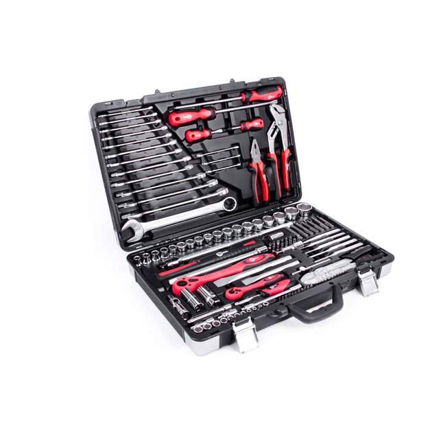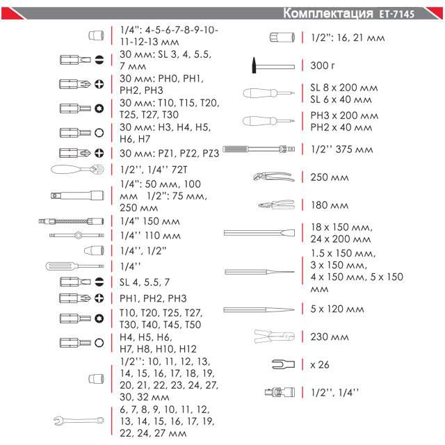 • Комплектация - 145 предметов: размер головок: 4-32 мм, размер рожково-накидных ключей: 6-27 мм, квадрат: 1/2", 1/4"; - пластиковый чемодан