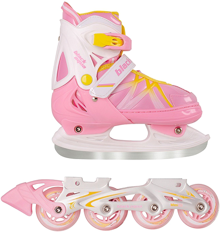 Детские раздвижные ролики-коньки для девочки. Ботинок сшит из «дышащей» ткани с уплотненной сеткой, морозостойкой искусственной кожи и практичного нейлона. Надежно зафиксировать его на ноге поможет шнуровка, а также липучка и защелка из пластика, затягивающие ботинок под обхват голени и подъем стопы.