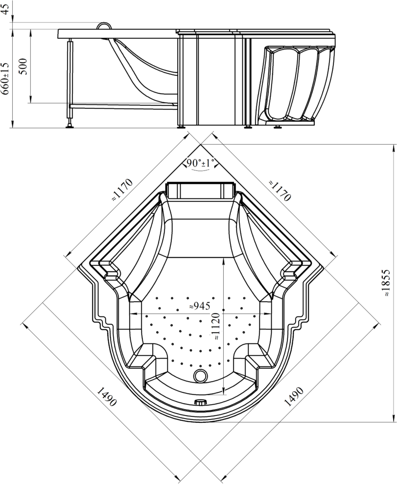 - Размер ванны (Д.;Ш.;В., см.): 149x149x от от 69 до 72 см