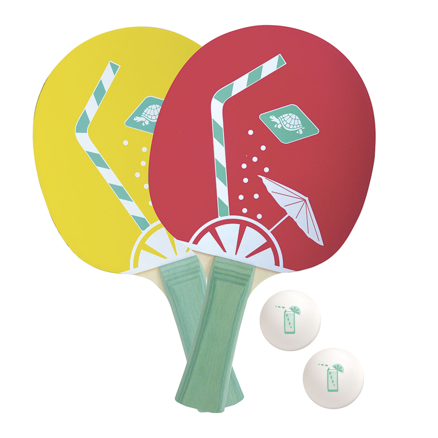 В комплект входит 2 ракетки, с красным и жёлтым покрытием. На покрытие нанесен принт белого цвета.