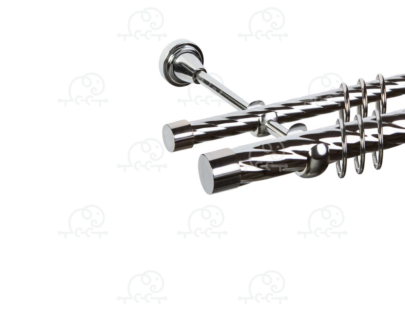 Модели карнизов различаются по фактурной композиции трубы (гладкая, рифленая, крученая) и по цветовому исполнению – Хром, Антик или Сатин.