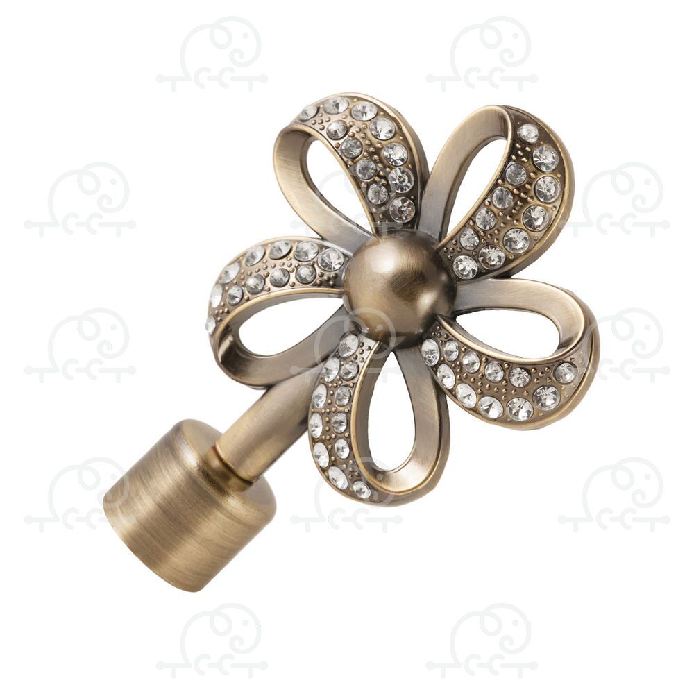 Карнизы линейки «Ромилда» станут источником праздничного настроения в любом интерьере. Достаточно просто взглянуть на то, как стандартный металлический карниз преображает наконечник с невероятно выразительными декоративными свойствами. Крупный и выразительный цветок с пятью круглыми лепестками, сходящимися в шарообразной бусине-центре на подставке-основе богато декорирован кристаллами, которые при попадании света создают бриллиантовый блеск.