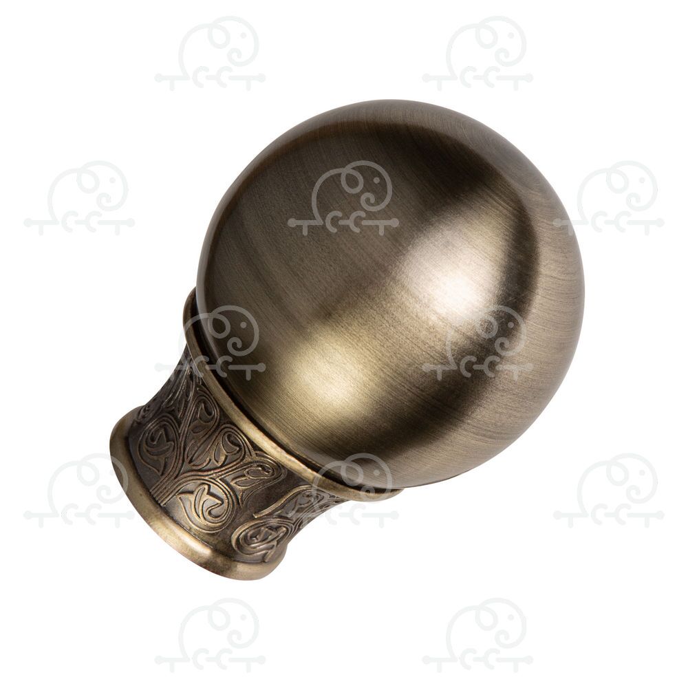Гениальный своей простотой контур трубы карниза завершается гладким и бесхитростным наконечником в виде усредненных размеров шара. Но, если обратить внимание на вогнутую по верхнему краю подставку-трапецию, на которой установлен шар, станут очевидными все декоративные достоинства наконечника.
