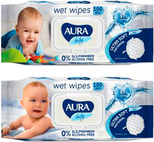 AURA BEAUTY Детские влажные салфетки Baby 97% воды 100 шт.