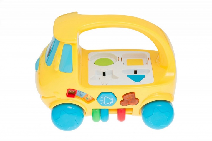 По обеим сторонам автобуса есть игровые элементы: с одной стороны расположены счеты, с другой - трещотка.