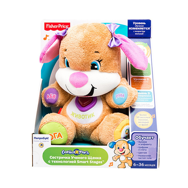 Сестричка ученого щенка от Fisher Price с разноцветными лапками, ушками и большим розовым носом – это мягкая надежная подружка и учитель, которая бесспорно станет любимой игрушкой вашего малыша. Каждый ребенок индивидуален и развивается в разном темпе, а умная технология Smart Stages , которой оснащена девочка-щенок, позволит самостоятельно выбирать подходящий уровень обучения для малыша.