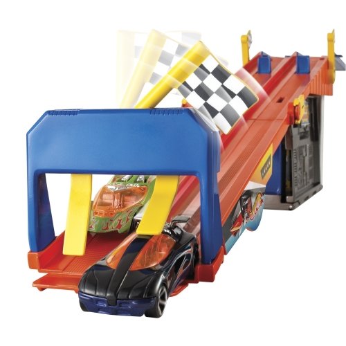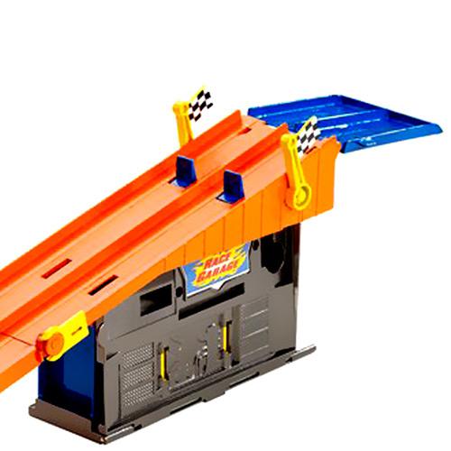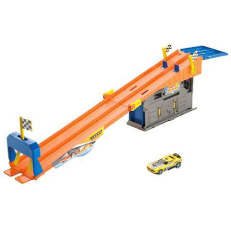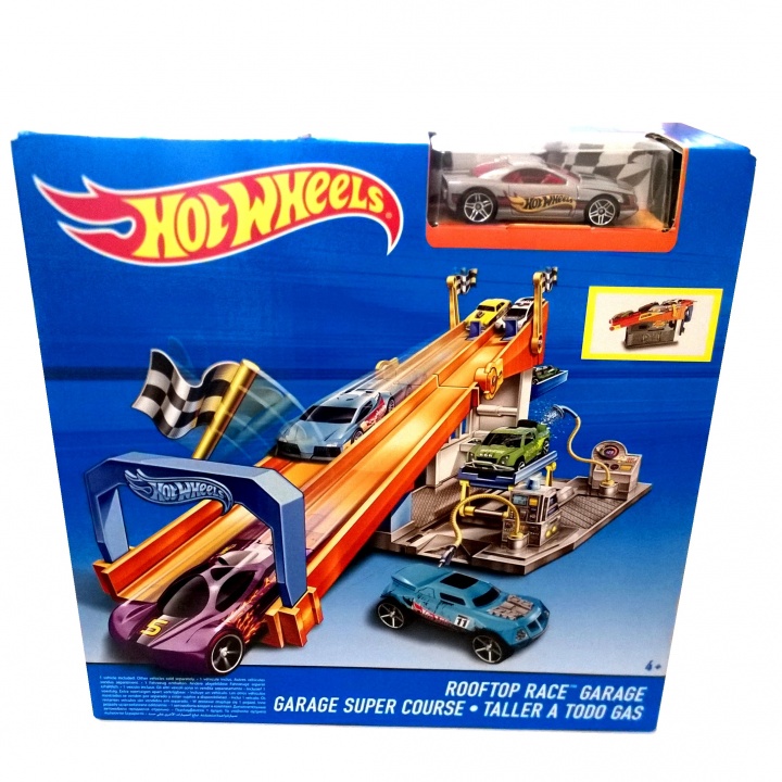 Набор включает элементы для установки гаража, детали автотрека и 1 базовую металлическую машинку Hot Wheels (в длину около 7 см).