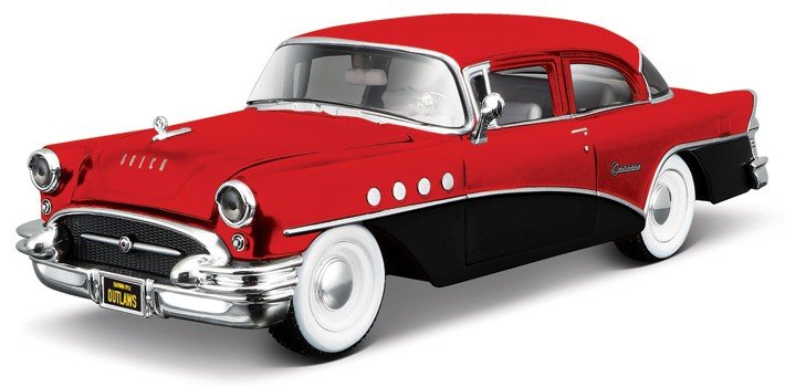 У Бьюик Сенчури (1955) литой металлический корпус красного цвета. Двери и капот автомобиля открываются.