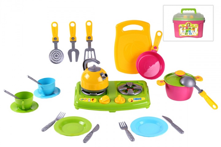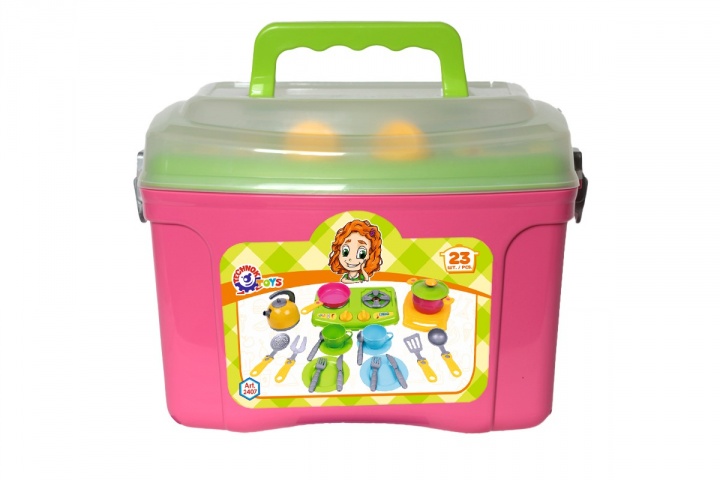 Компактный кухонный набор вызовет восторг у ребенка, ведь теперь его можно брать с собой повсюду: игры в песочнице или дома - это не имеет значения, ведь все атрибуты умещаются в одном контейнере!