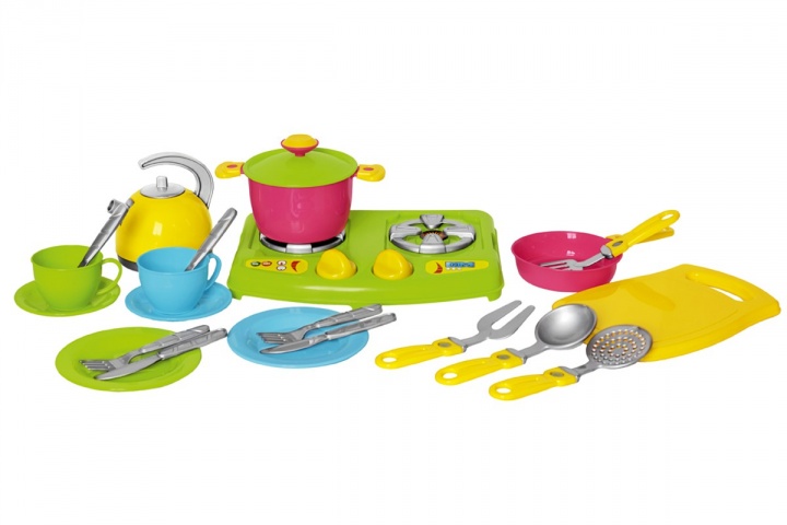 В наборе: 1 контейнер, варочная панель, 2 тарелки, 2 блюдца, 2 чашки, 1 кастрюля, 1 крышка, 2 ложечки, 2 вилки, 2 ножика, 1 чайник с крышкой, 1 досточка для нарезки, 1 черпак-шумовка, вилка большая, 1 лопатка, 1 саквояж.