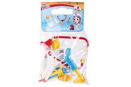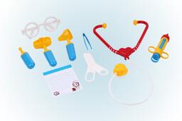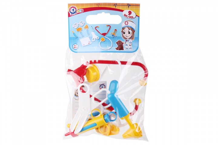 В наборе: стетоскоп, шприц, термометр, очки, молоток, пинцет, отоскоп, ножницы.