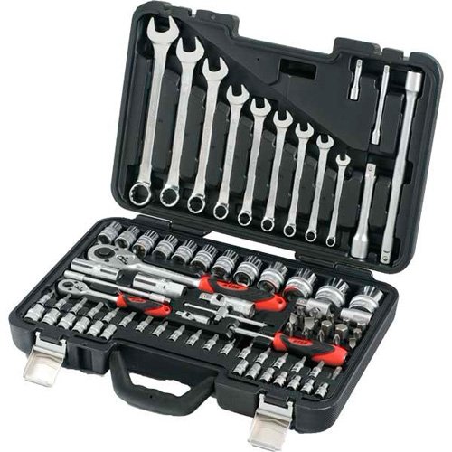 - Наличие в наборе Удлинители 1/2", Трещотка 1/4", Трещотка 1/2", Торцевые головки 1/4", Торцевые головки 1/2", Отвертка под биты, Комбинированные ключи, Головки свечные, Биты