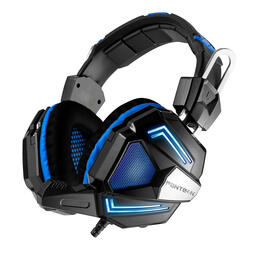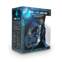 Игровые наушникис микрофоном с LED-подсветкой Jet.A GHP-300 чёрно-синяя (звуковая схема 2.0, управление на наушнике, 2x mini jack 3.5мм 3pin+USB + адаптер mini jack 3.5мм 4pin, кабель 2.2м)