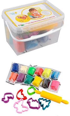 В наборе: 12 пакетиков тесто-пластилина, 1 стек, 6 формочек.