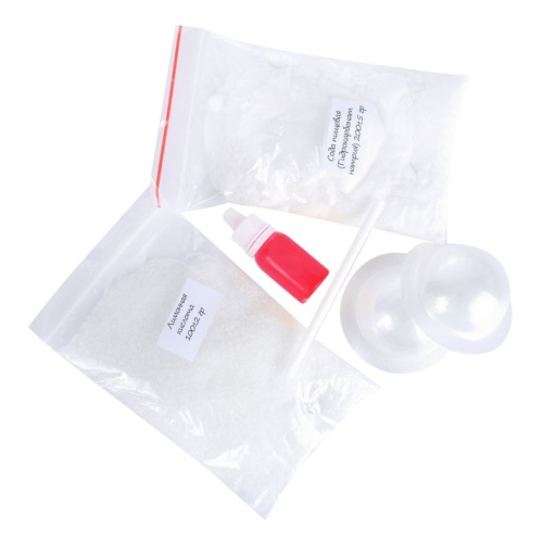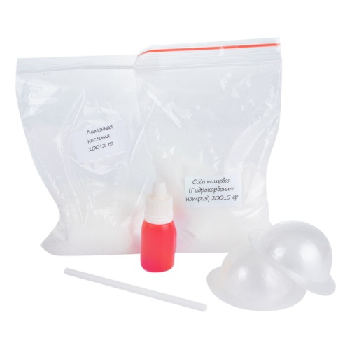 В наборе: 2 компонента для создания бомбочек (сода и лимонная кислота), краситель розовый, ароматизатор "клубника", инструкция.