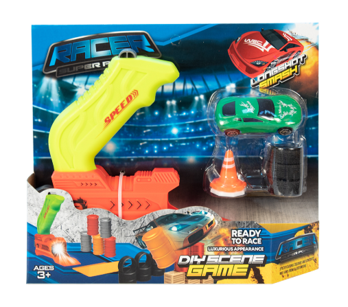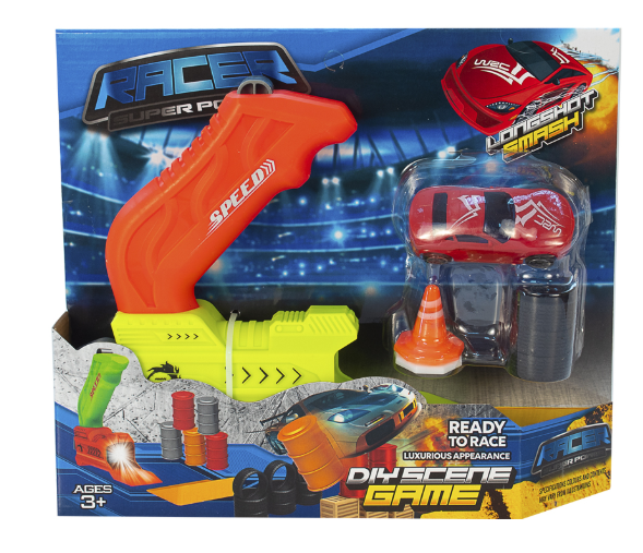 В набор входит: машинка, пусковое устройство, 3 шины, 2 конуса.