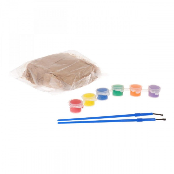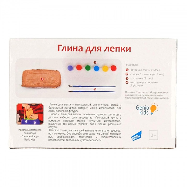 В набор входит: глина- 400 г, акриловые краски (6 цветов по 3 мл), кисточка- 2 шт., инструкция по лепке различных поделок.