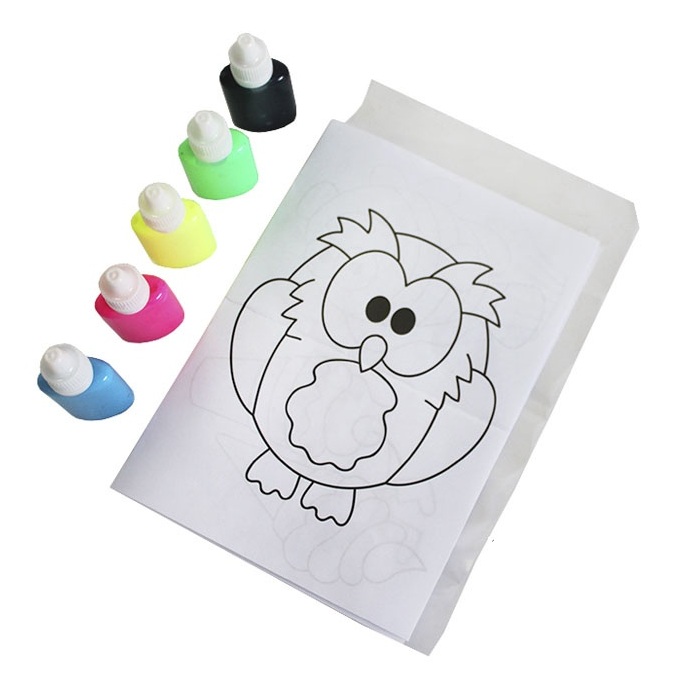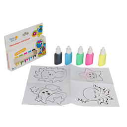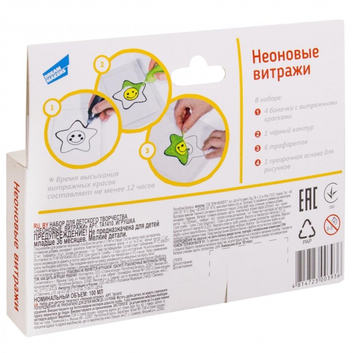 В наборе: 4 баночки с красками по 20 мл, 1 черный контур, 6 трафаретов, 1 прозрачная основа для рисунков.
