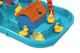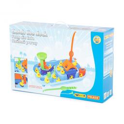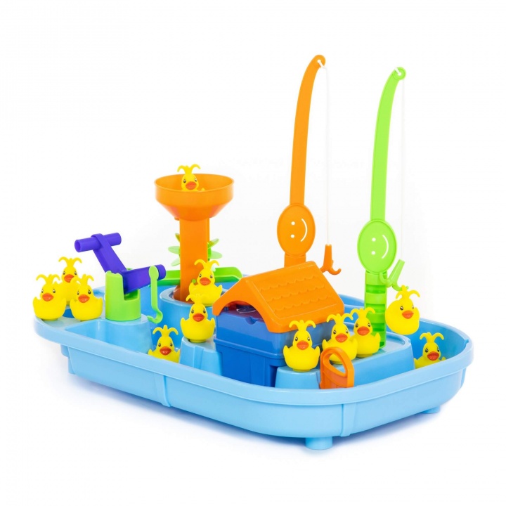 Игра "Поймай уточку"- увлекательная игра для одного или двух игроков. Уточки благодаря водному мотору (механический) в мельнице не стоят на месте, а передвигаются по бассейну. Включается моторчик путем нажатия кнопки на крыше домика. Цель - поймать как можно больше утят на удочку.