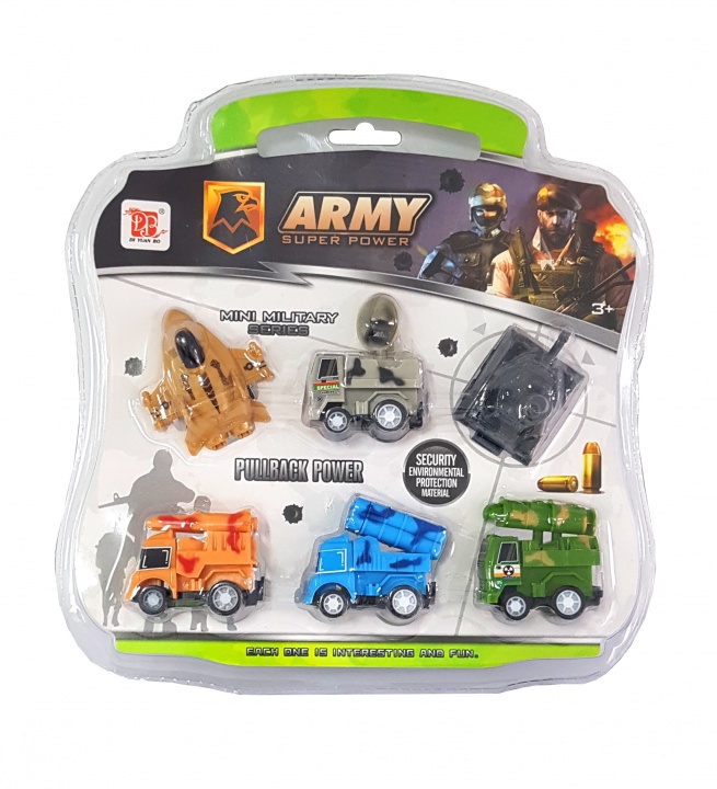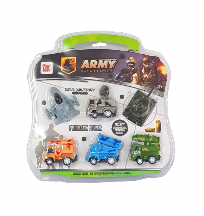 Игровой набор из шести миниатюрных машинок, с которыми малыш сможет почувствовать себя настоящим водителем военной автотехники! С таким набором ребенок с удовольствием будет не только наслаждаться игрой, но и сможет выучить названия транспортных средств, предназначенных для военного дела.