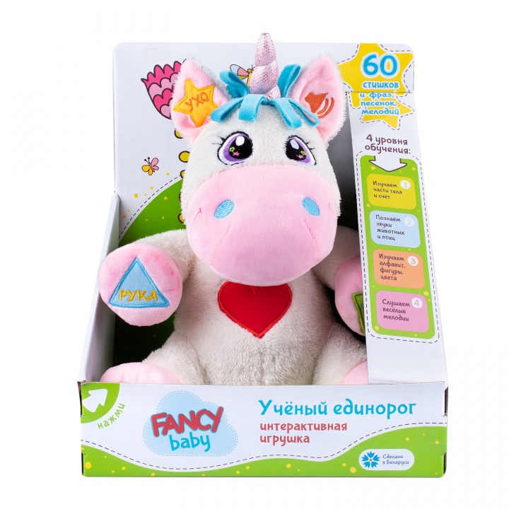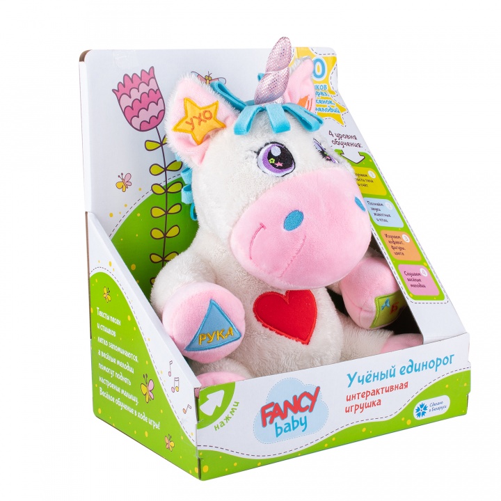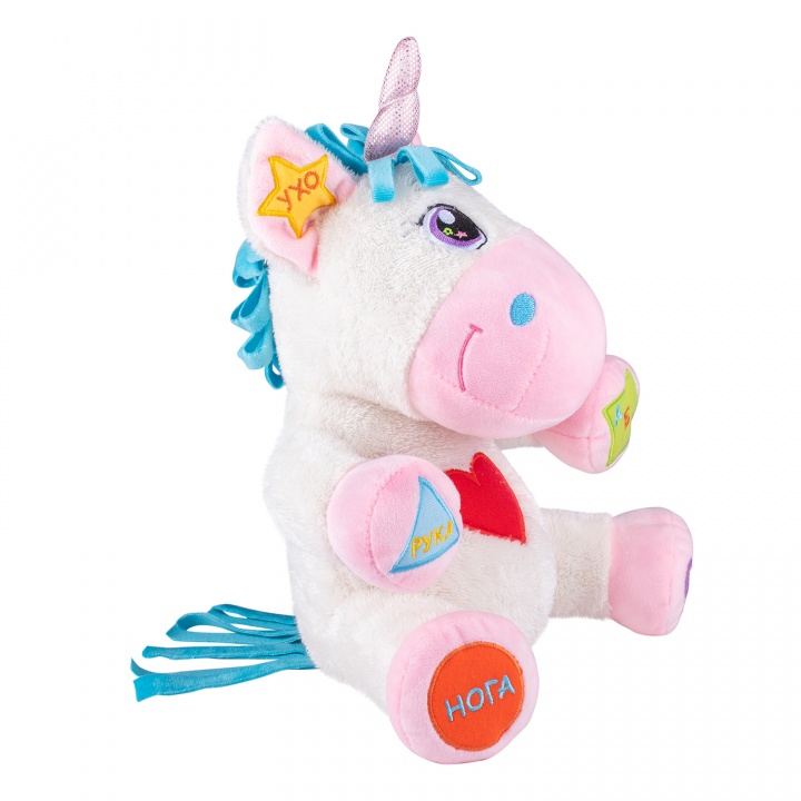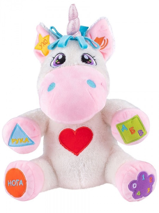 Милая плюшевая игрушка в образе волшебного единорога станет настоящим другом для вашего крохи, который не только подарит малышу нежные объятия, но и позволит значительно расширить словарный запас, познакомит с алфавитом, песнями и фразами, фигурами, цветами, звуками животных и птиц.