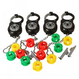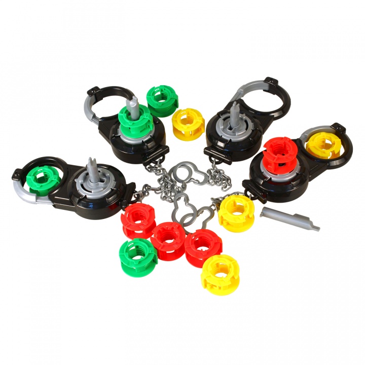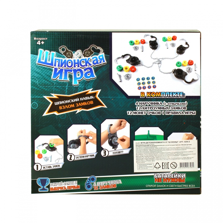 В комплекте: 4 наручника (с отмычками), 12 хитроумных замков, 12 монет очков, правила игры.