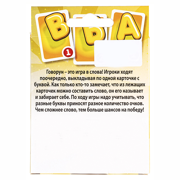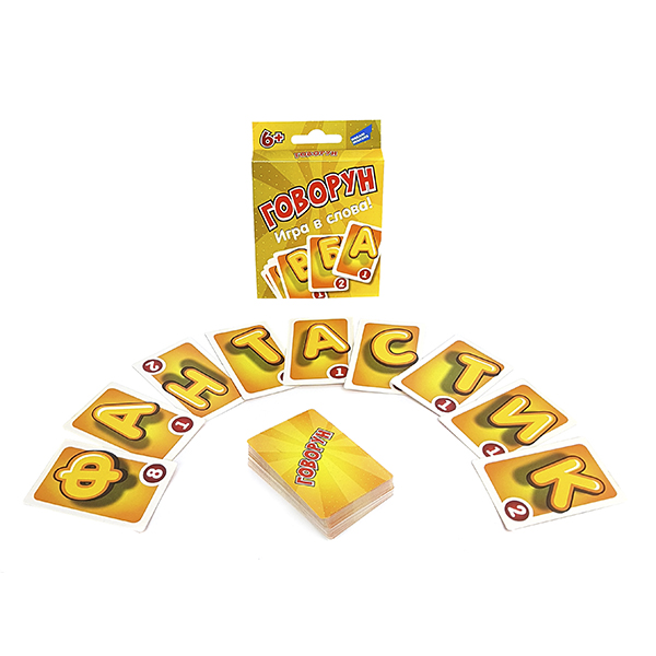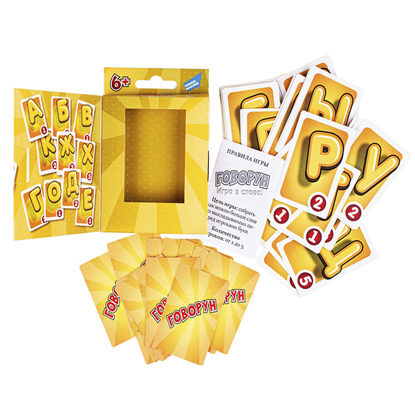 Карточная игра "Говорун. New" - это игра в слова. Игроки ходят поочередно, выкладывая по одной карточке с буквой. Как только кто-то замечает, что из лежащих карточек можно составить слово, он его называет и забирает себе. По ходу игры надо учитывать, что разные буквы приносят разное количество очков. Чем сложнее слово, тем больше шансов на победу.