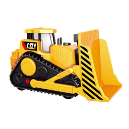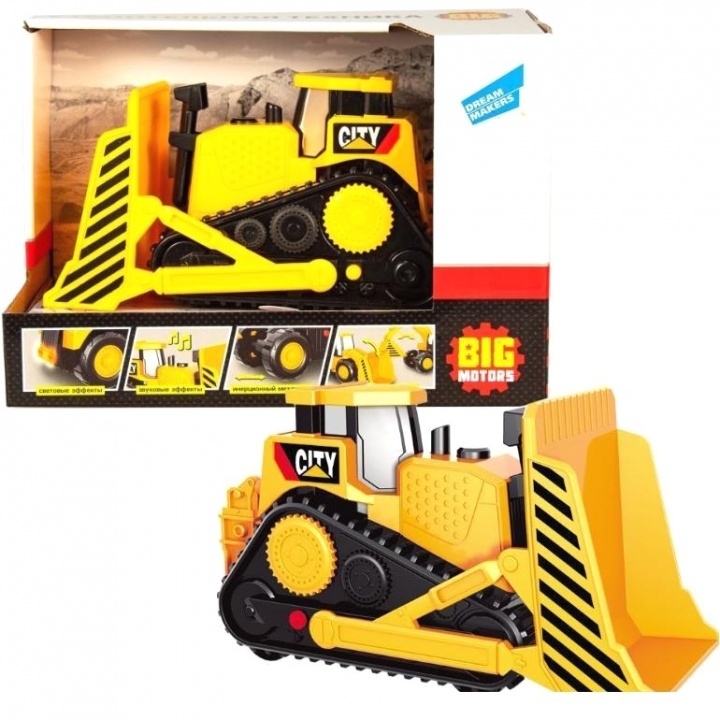Машинка яркого желто-оранжевого цвета с черными колесами и элементами на кузове имеет отличную детализацию и очень походит на реальную модель строительной машины. У машинки поднимается ковш. Кроме этого, машинка обладает световыми и звуковыми эффектами для большей реалистичности, а также обладает инерционным механизмом.