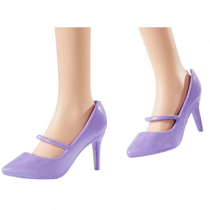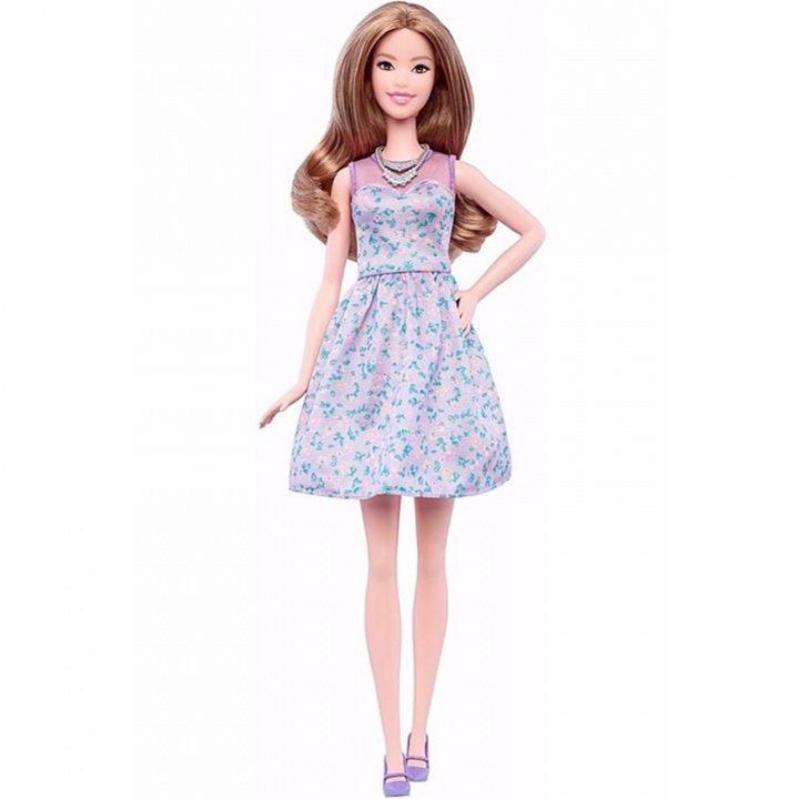 Куколка Барби обожает красивые и модные наряды, в которых всё продумано до мелочей. Она одета в классическое платье с пышной юбкой и модным принтом. Образ дополняют сиреневые туфли, которые очень гармонично смотрятся с платьем.