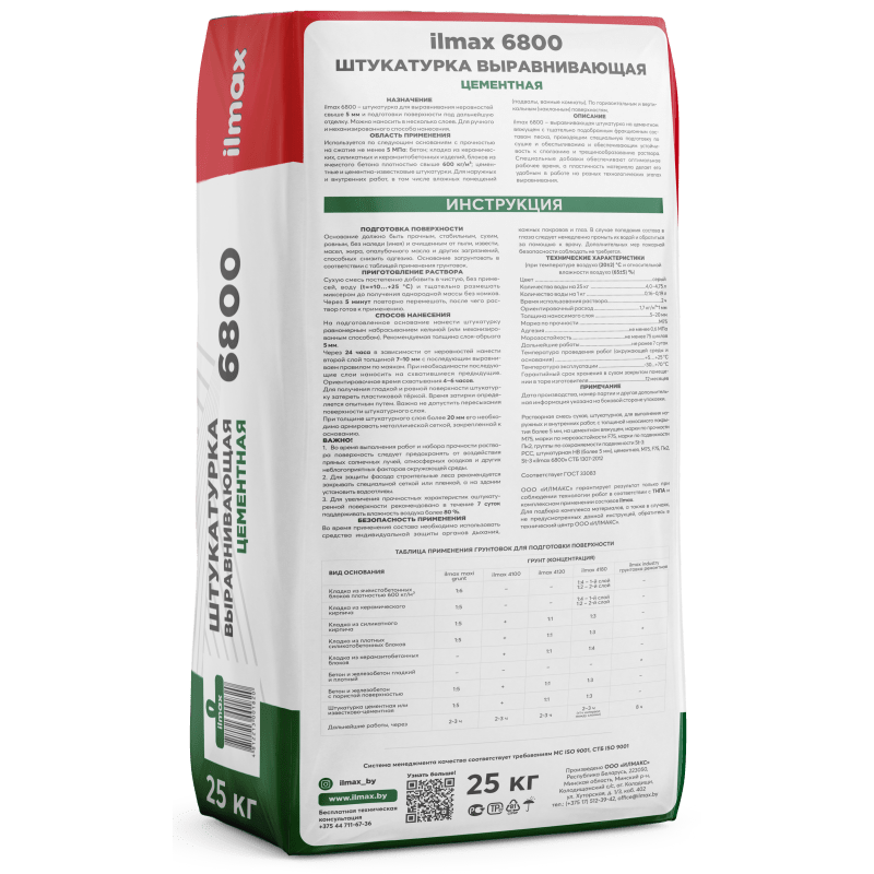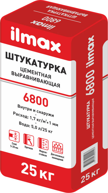 Цементно-известковая смесь ilmax 6800 предназначена для выравнивания неровностей в сухих и влажных помещениях при проведении наружных и внутренних работ. Морозостойкая, с высокой паропроницаемостью. Толщина слоя 5-20 мм. Расход 1,7 кг/м2/мм.