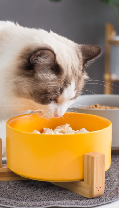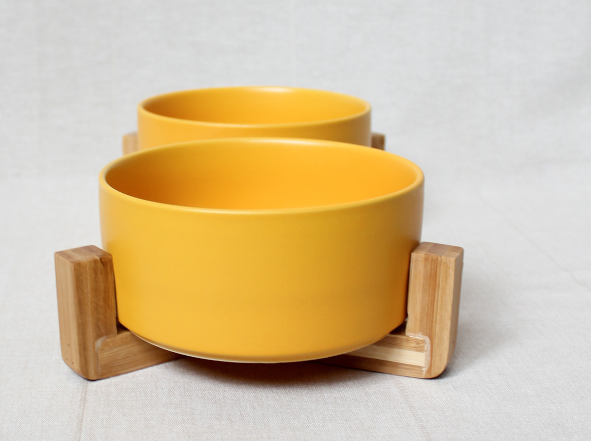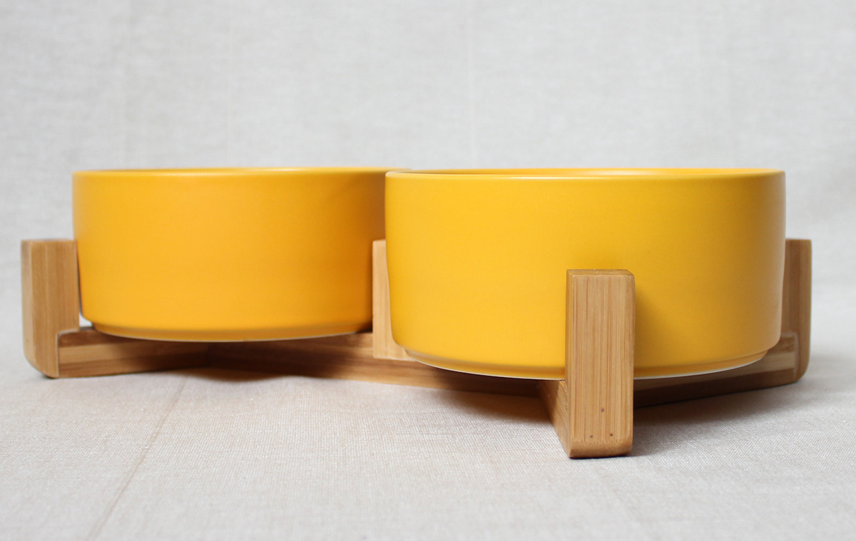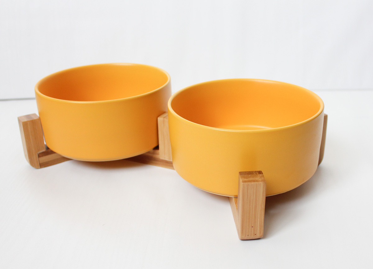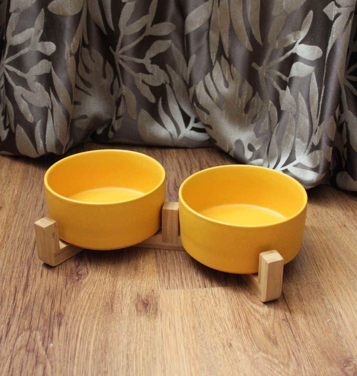 Керамическая двойная миска для корма HOUMI миска для корма двойная на деревянной подставке для кошек и собак, желтый