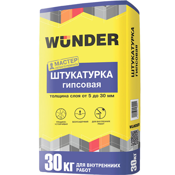Штукатурка гипсовая Wunder 30 кг применяется для выравнивания стен, перегородок, потолков по бетонным, кирпичным, пенобетонным основаниям. Используется внутри помещений с умеренным температурным режимом. Поверхность перед нанесением должна быть очищенной от пыли и масляных пятен. Штукатурка после покрытия устойчива к влаге, загрязнению и грибкам. Ориентировочный расход сухой смеси при толщине слоя 10 мм составляет 8-9 кг/м2. Для работы необходимо приобрести пластмассовую емкость, электродрель с мешалкой (миксер), терки и шпатель.