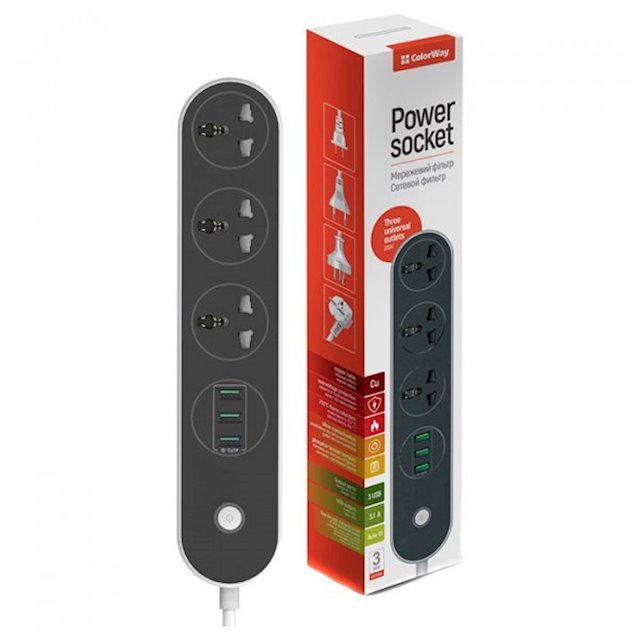 Сетевой фильтр COLOR WAY 3 розетки/3USB Black 1.8M (CW-CHU33B)