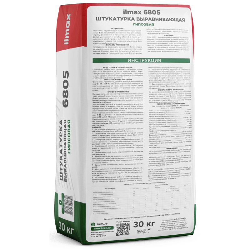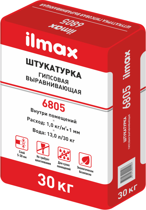Штукатурка выравнивающая гипсовая ilmax 6805 предназначена для внутренней отделки стен и потолков в сухих помещениях. Толщина наносимого покрытия 5-30 мм. Может укладываться в несколько слоев. Обладает тепло- и звукоизолирующими свойствами. Экологически безопасна, не содержит вредных веществ. Не требует шпатлевания. Расход — 0,9-1,0 кг/м2*1 мм. Количество воды на 30 кг — 12,6-13,5 литров. Вес — 30 кг.