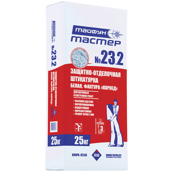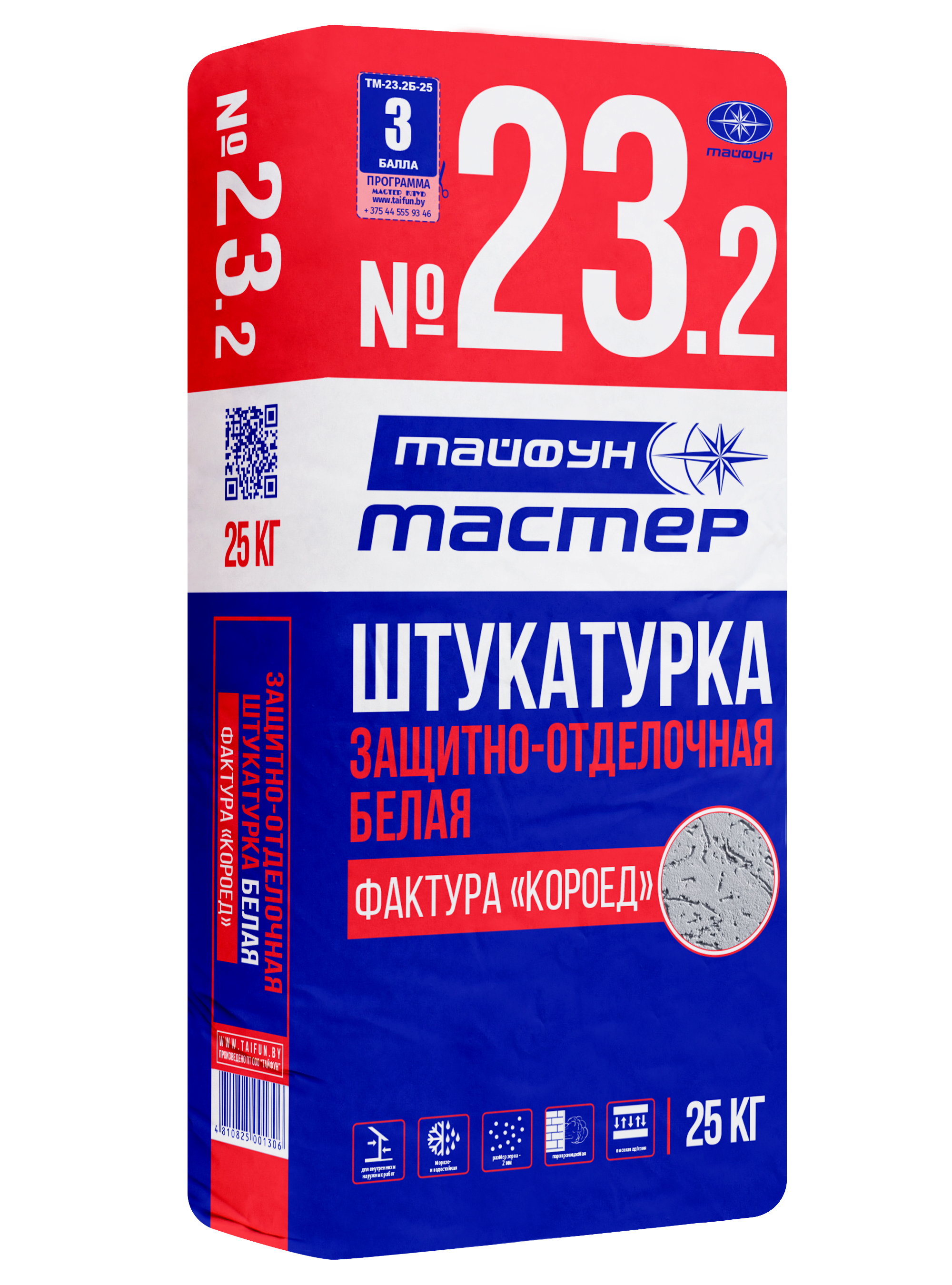 Штукатурка цементная Тайфун Мастер № 23,2 применяется для изготовления защитно-декоративного слоя с фактурой (короед 2 мм) по минеральным основаниям, в системах теплоизоляции внутри и снаружи помещений. Поверхность перед нанесением должна быть ровной, очищенной от пыли и масляных пятен, и укреплена грунтовкой. Штукатурка после покрытия устойчива к влаге, загрязнению и грибкам. Ориентировочный расход сухой смеси составляет 4,0 кг/м2. Для работы необходимо использовать пластмассовую емкость, электродрель с мешалкой (миксер), терки, шпатель. Поставляется по 25 кг.