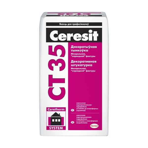 Ceresit СТ 35 — декоративная штукатурка с зерном до 3,5 мм. Используется для тонкослойного покрытия на бетонные, гипсовые, цементно-песчаные основания. Широко применяется в качестве декоративно-защитного слоя при утеплении фасадов. Расход — 3,5-4 кг на м2. Наносится на сухие, прочные, предварительно очищенные поверхности. Предусмотрено окрашивание акриловой(СТ 42), силиконовой (СТ 48) краской через 7 суток, силикатной (СТ 54) через 3 суток. Подходит для внутренних и наружных работ. Штукатурка упакована в мешки по 25 кг.