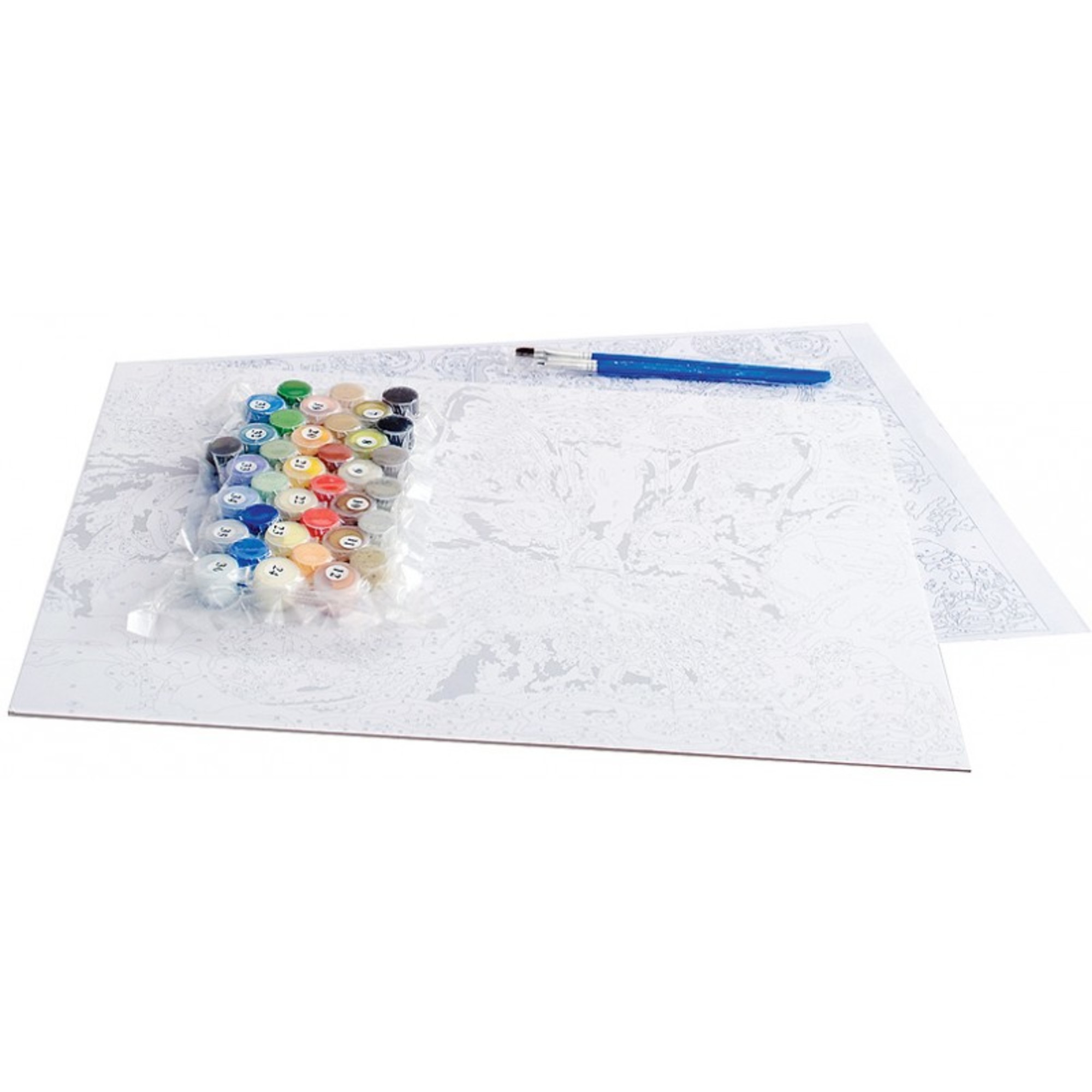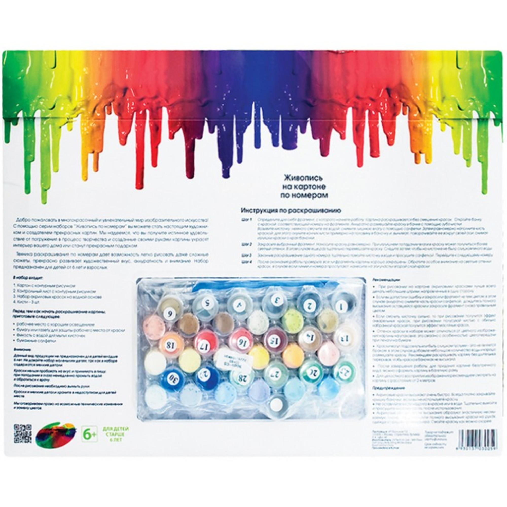 • Состав комплекта 1. Картон с контурным рисунком (29.5*39.5 см.) – 1 шт. 2. Контрольный лист с контурным рисунком 3. Акриловые краски на водной основе 4. Кисти – 4 шт. 5. Листовка о художнике