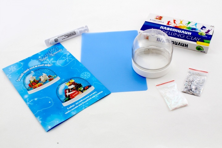В наборе вы найдете все самое необходимое, чтобы претворить фантазию в реальность! Слепите композицию и поместите её внутрь шара. Добавьте блестки и специальную жидкость. Завершив создание шара, встряхните его и с гордостью понаблюдайте, как невесомые маленькие снежинки медленно укутывают вашу поделку.