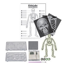 В наборе: формы для отливки костей 2 шт, рентгеновские пленки 3 шт, настенная схема скелета, пакеты с гипсовым порошком, кисть, серая и светящаяся в темноте краски, магниты в форме костей, инструкция.