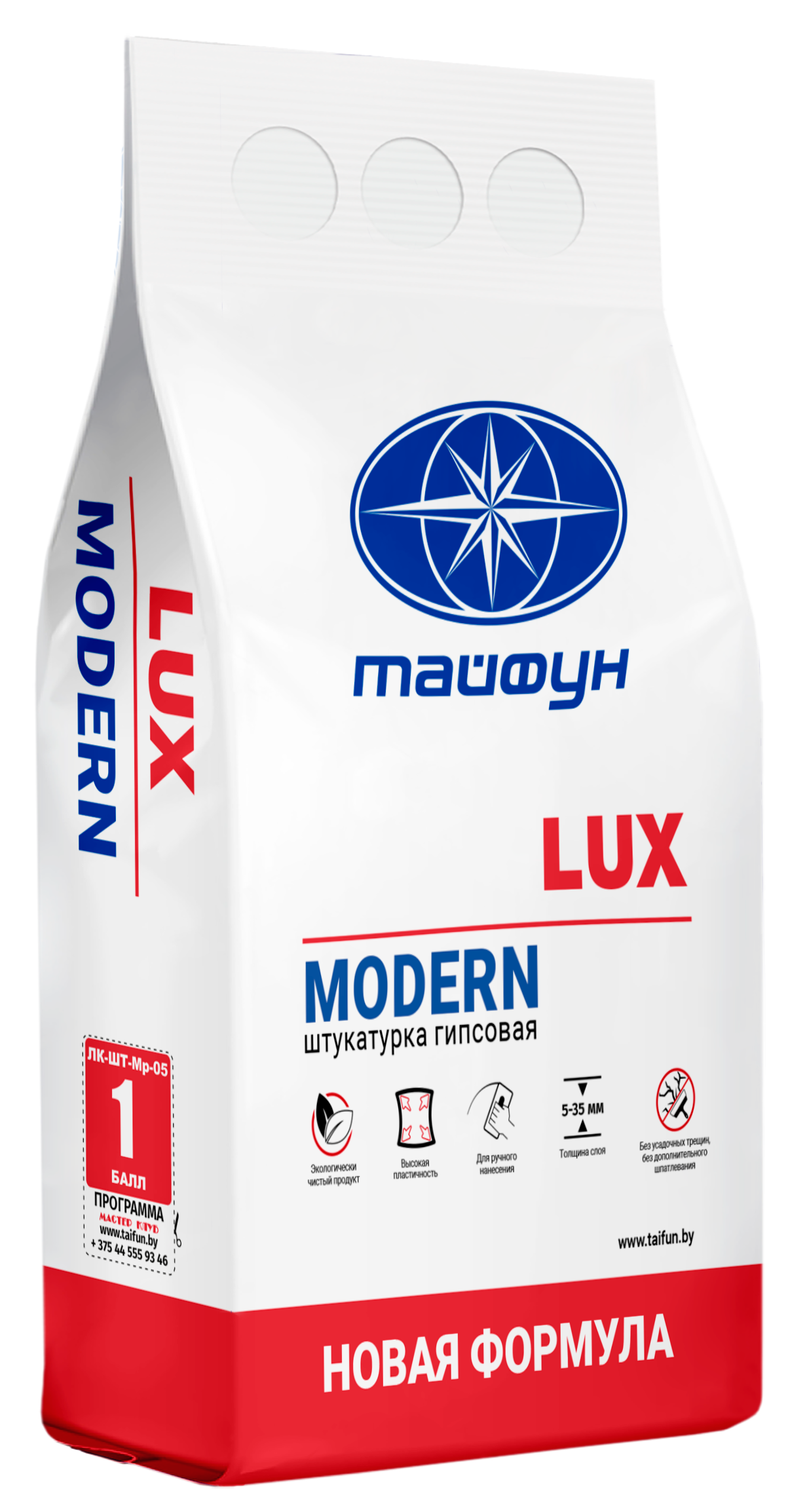 Гипсовая штукатурка Тайфун Люкс Модерн применяется для выравнивания потолков, стен и перегородок. Наносится с помощью шпателя в помещениях с нормальной температурой и влажностью. Расход составляет 1 кг/м? на 1 мм толщины слоя. Использование этого состава позволяет отказаться от шпатлевания перед нанесением декоративных покрытий. Упаковка 5 кг. Время использования до 60 мин. Цвет белый.