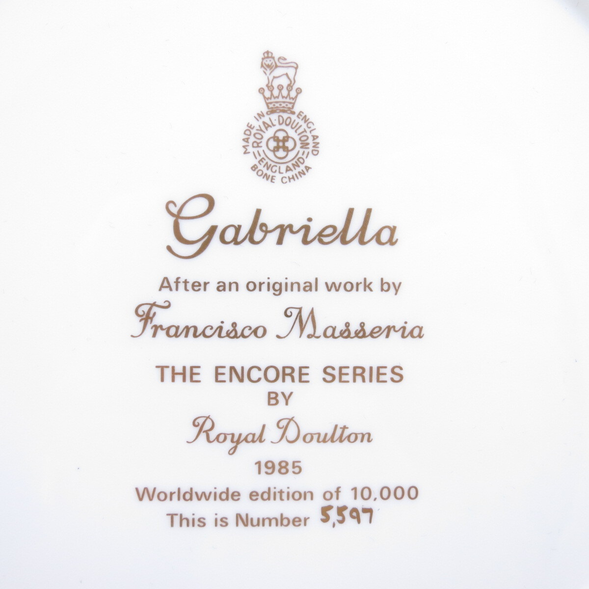 Декоративная винтажная коллекционная тарелка "Выход на бис: Габриелла". Фарфор, деколь, золочение, Великобритания, Франциско Массериа, Royal Doulton, 1985