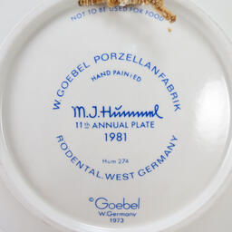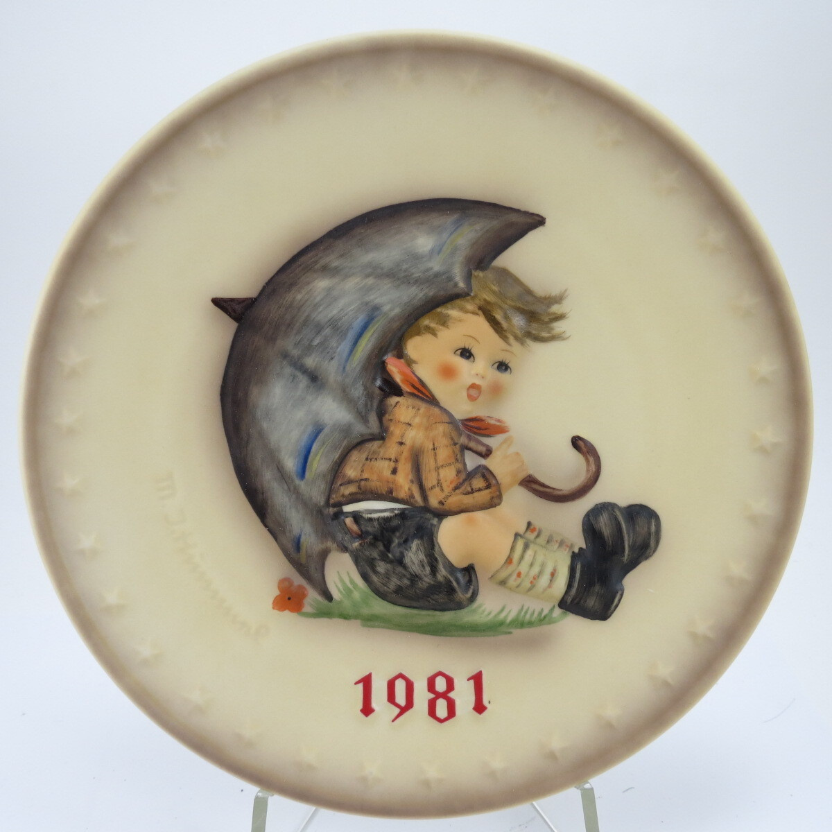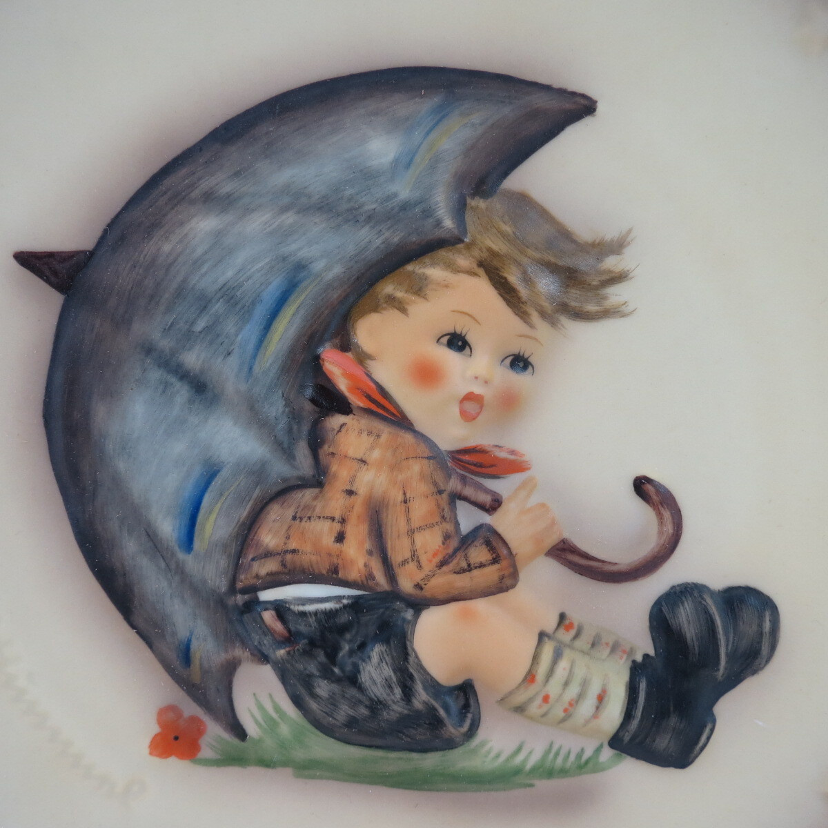 Декоративная коллекционная тарелка-барельеф "Дети Хуммель: Мальчик с зонтом". Фарфор, деколь. Германия, Берта Хуммель, Goebel, 1981