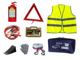 Набор автомобилиста Vimo: 9 предметов (сумка, аварийный знак, аптечка, жилет, огнетушитель, трос, перчатки, провода для прикуривания, башмак противооткатный)