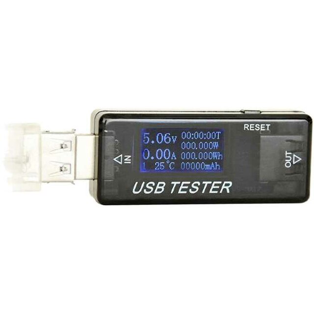 - Основные характеристики Входное напряжение: 4-30 В; Максимальный ток: 5 А; Измерение потребленной мощности: 0 - 150 Вт; Время измерения: 0 - 99 часов; Температурный режим: - 5 - 80 °C; Чувствительность: 10 мВ, 1 мА; Соединение: USB-AM вход, USB-AF выход; Вес: 17 г