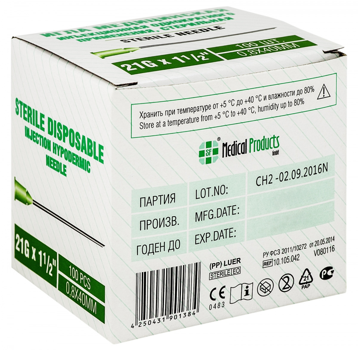 SF Medical 100 шт. Медицинские Иглы для шприцов одноразовые инъекционные однократного применения стерильные Размер 21G 1 1/2" (0,8x40мм)