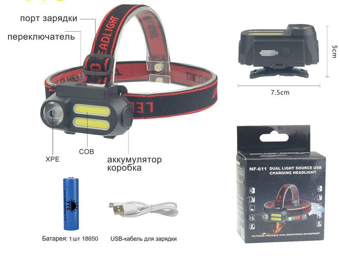 TEWSON YYC-611-XPE+COB Фонарь налобный светодиодный аккумуляторный с зарядкой от MicroUSB