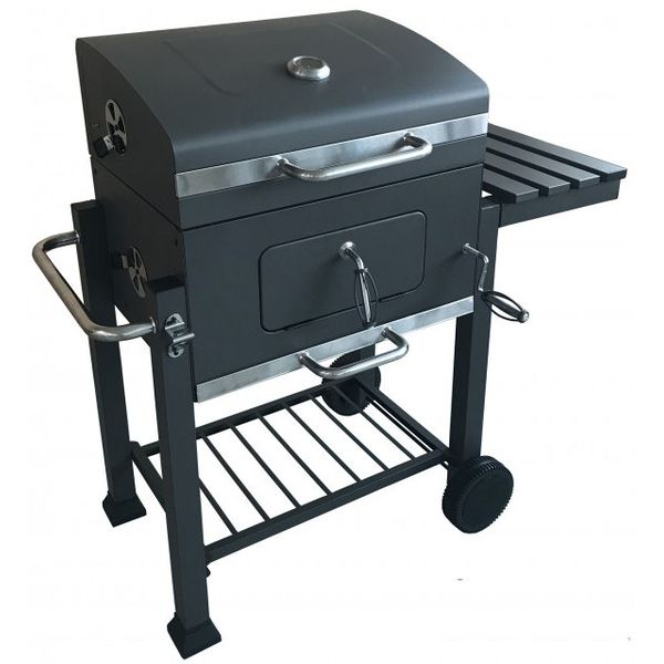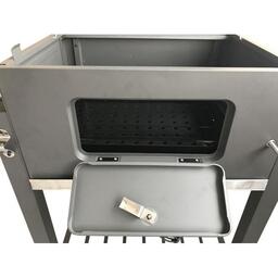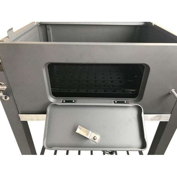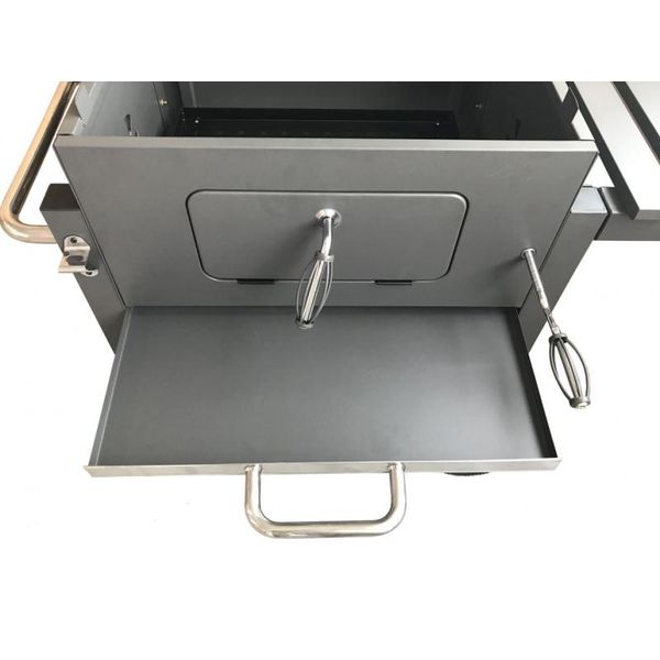 • Комплектация Хромированная греющая стойка (4 мм), решетка черная эмаль 2 шт (5 мм.), угольный поддон (регулировка по высоте), зольный ящик, вентиляционные клапаны 4 шт, боковой столик, нижняя полка, транспортировочные колеса, термометр