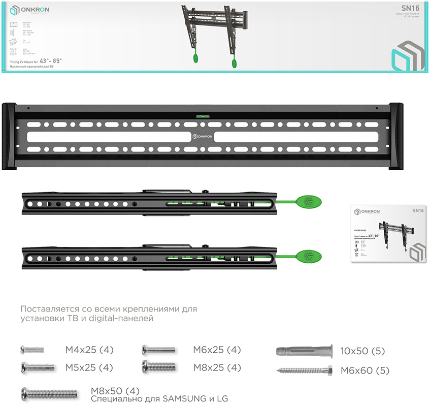 ONKRON наклонный кронштейн для ТВ 43"-85", черный SN16