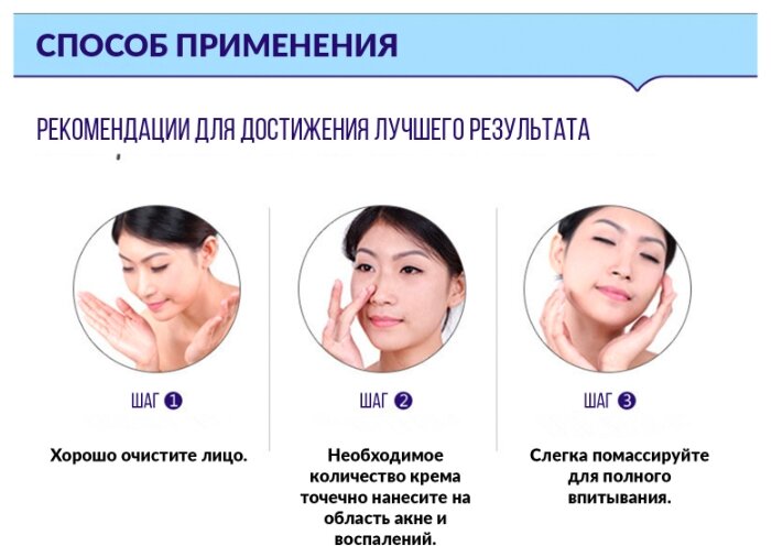 Способ примененияиспользовать крем рекомендуется утром, сразу после умывания, и на ночь; если потребуется, допускается также применение по необходимости, например, при появлении первых признаков воспаления; наносить крем следует на тщательно очищенную кожу лица; небольшое количество средства поместите на кожу, слегка помассируйте для полного впитывания; наибольшая эффективность достигается при использовании комплекса продуктов данной серии