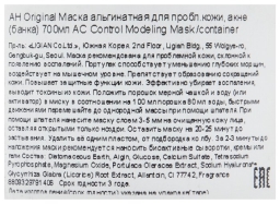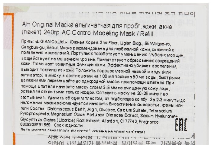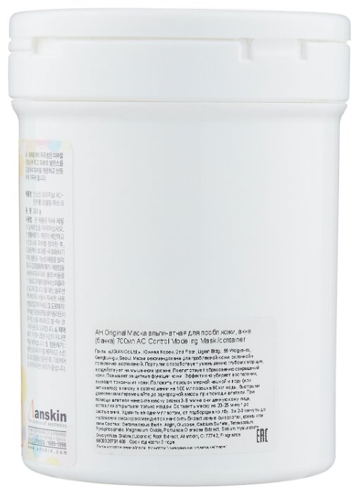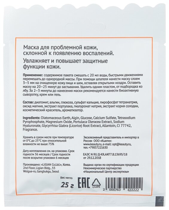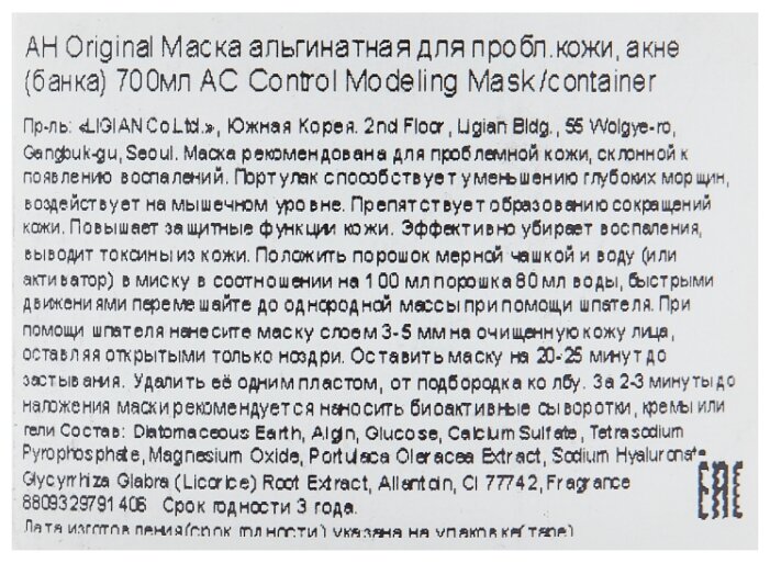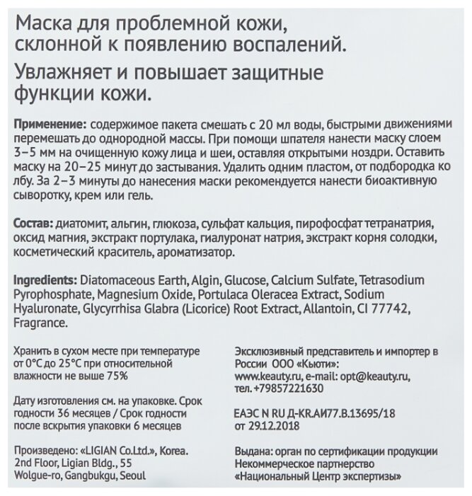 Способ примененияположить порошок мерной чашкой в воду (или активатор) в миску в соотношении на 100 мл порошка 80 мл воды, быстрыми движениями перемешайте до однородной массы при помощи шпателя; при помощи шпателя нанесите маску слоем 3-5 мм на очищенную кожу лица, оставляя открытыми только ноздри; оставить маску на 20-25 минут до застывания; удалить её одним пластом, от подбородка ко лбу